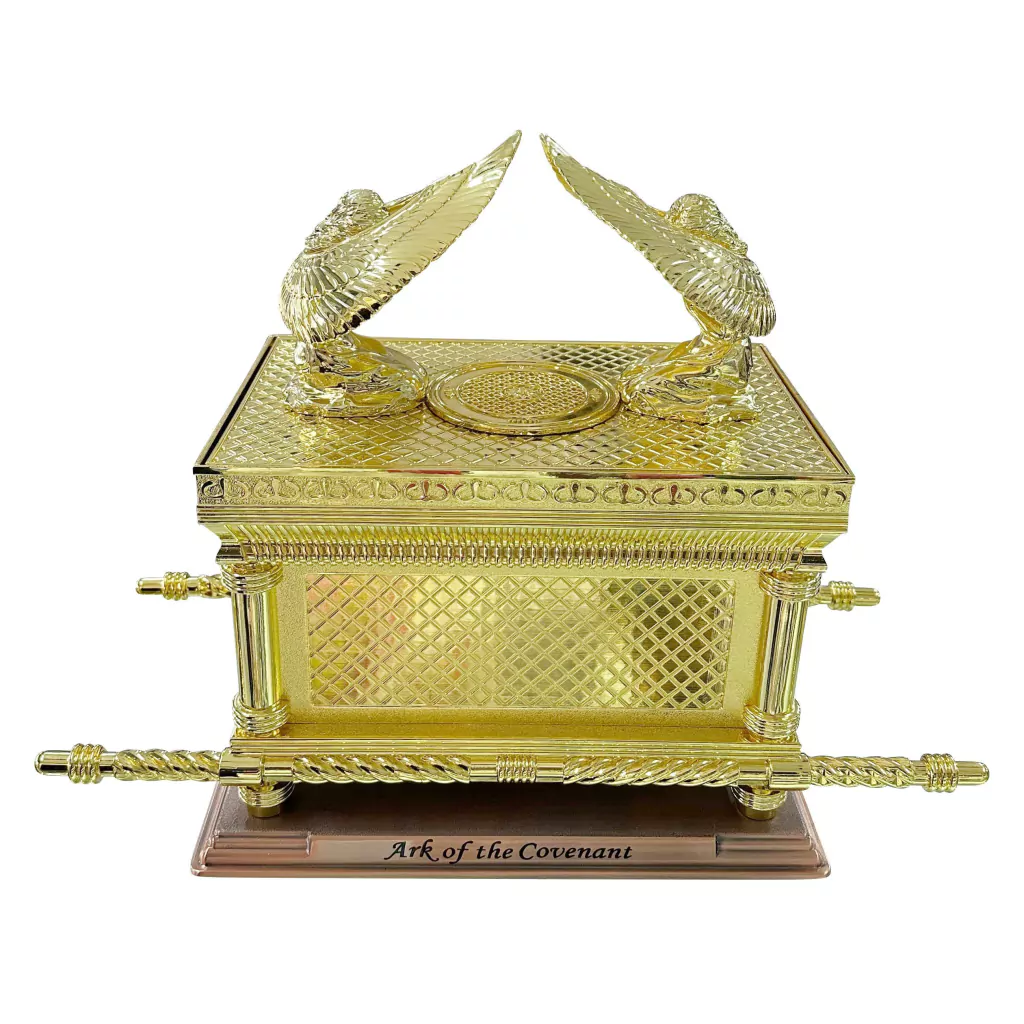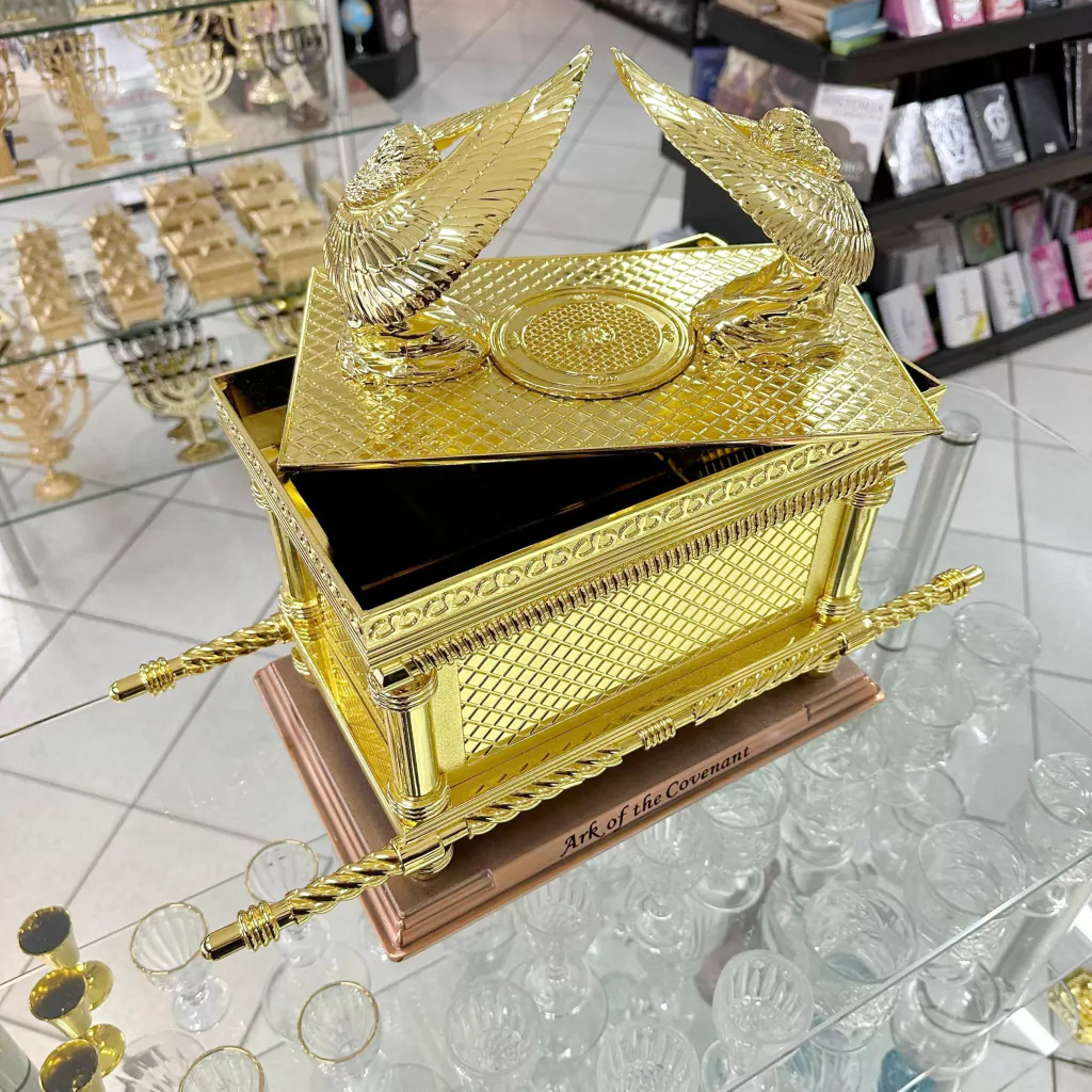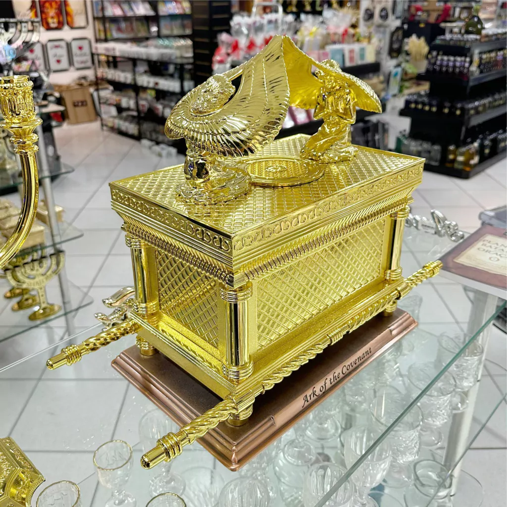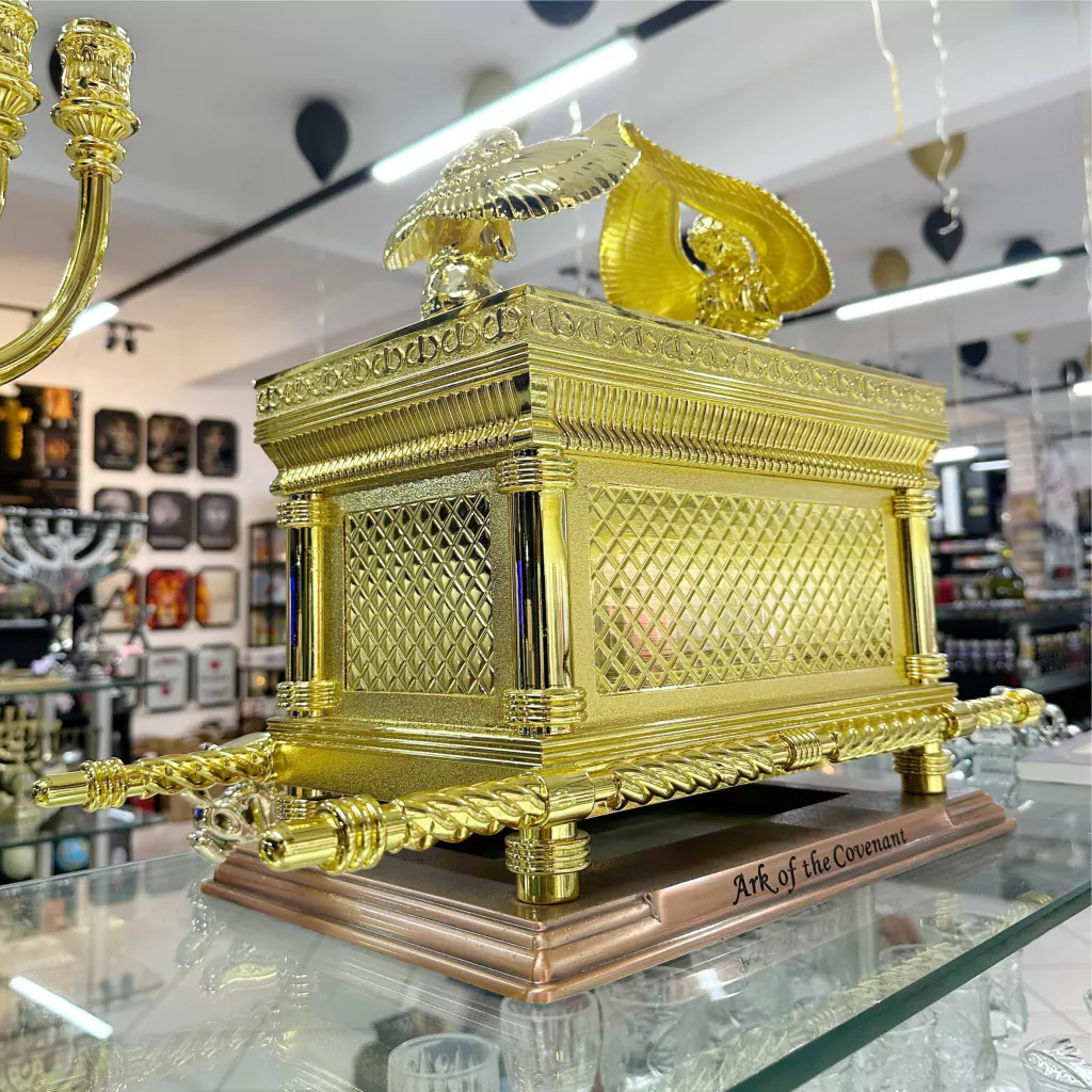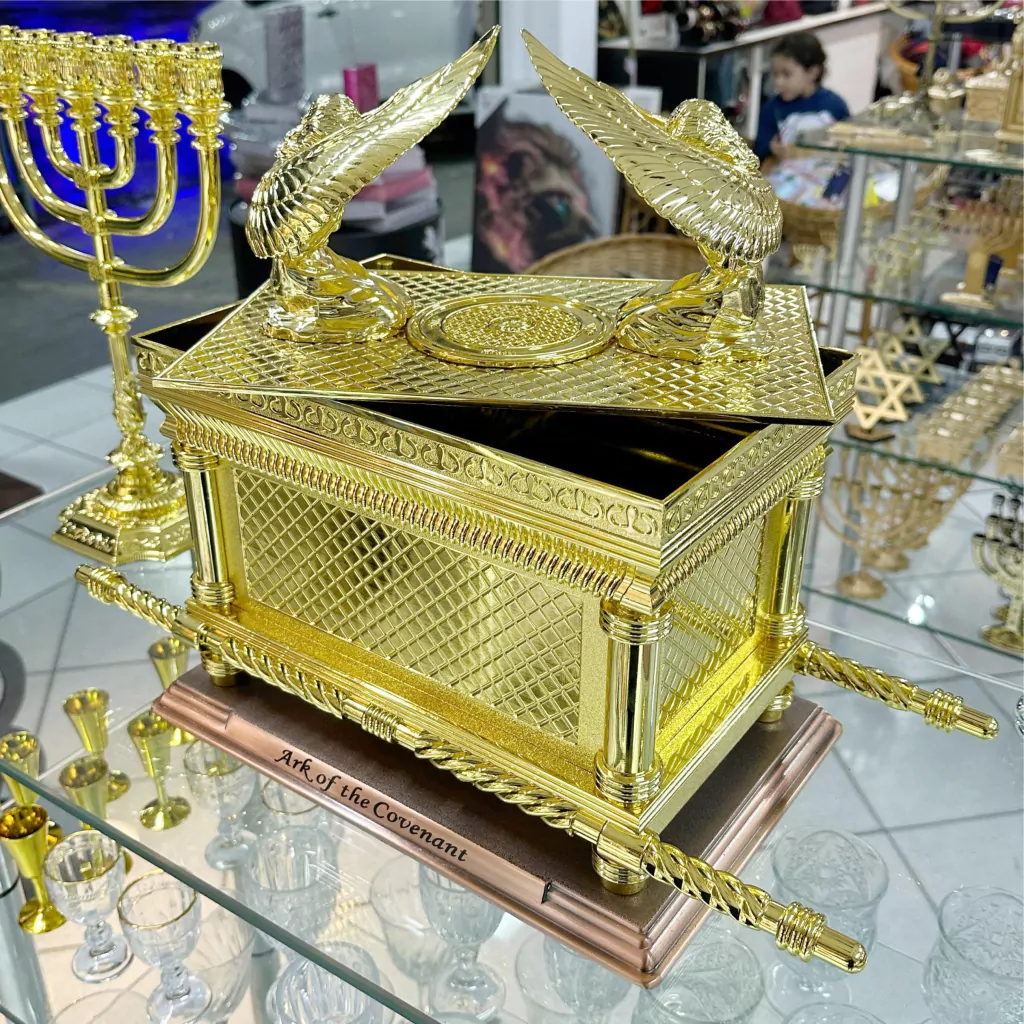 Arca da Aliança folheada a ouro importada de Israel, uma obra-prima de artesanato sacro, inspirada nos relatos bíblicos. Meticulosamente revestida com ouro, esta réplica fiel simboliza a aliança sagrada entre Deus e o povo de Israel. Com detalhes ricamente esculpidos e um acabamento impecável, esta peça não só representa um tesouro espiritual, mas também um objeto de admiração artística e histórica.