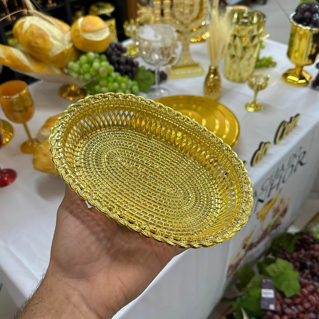 Bandeja Oval dourada, perfeita para decorar Mesa de Santa Ceia.
