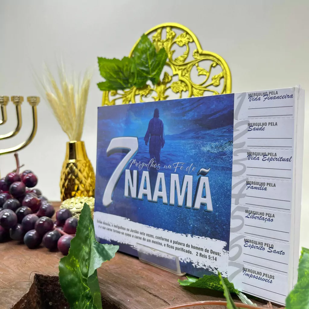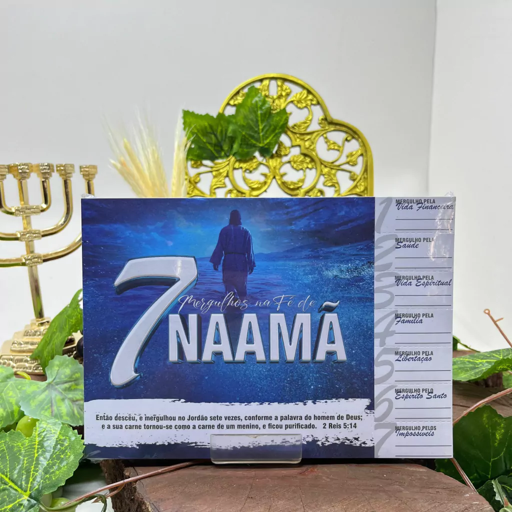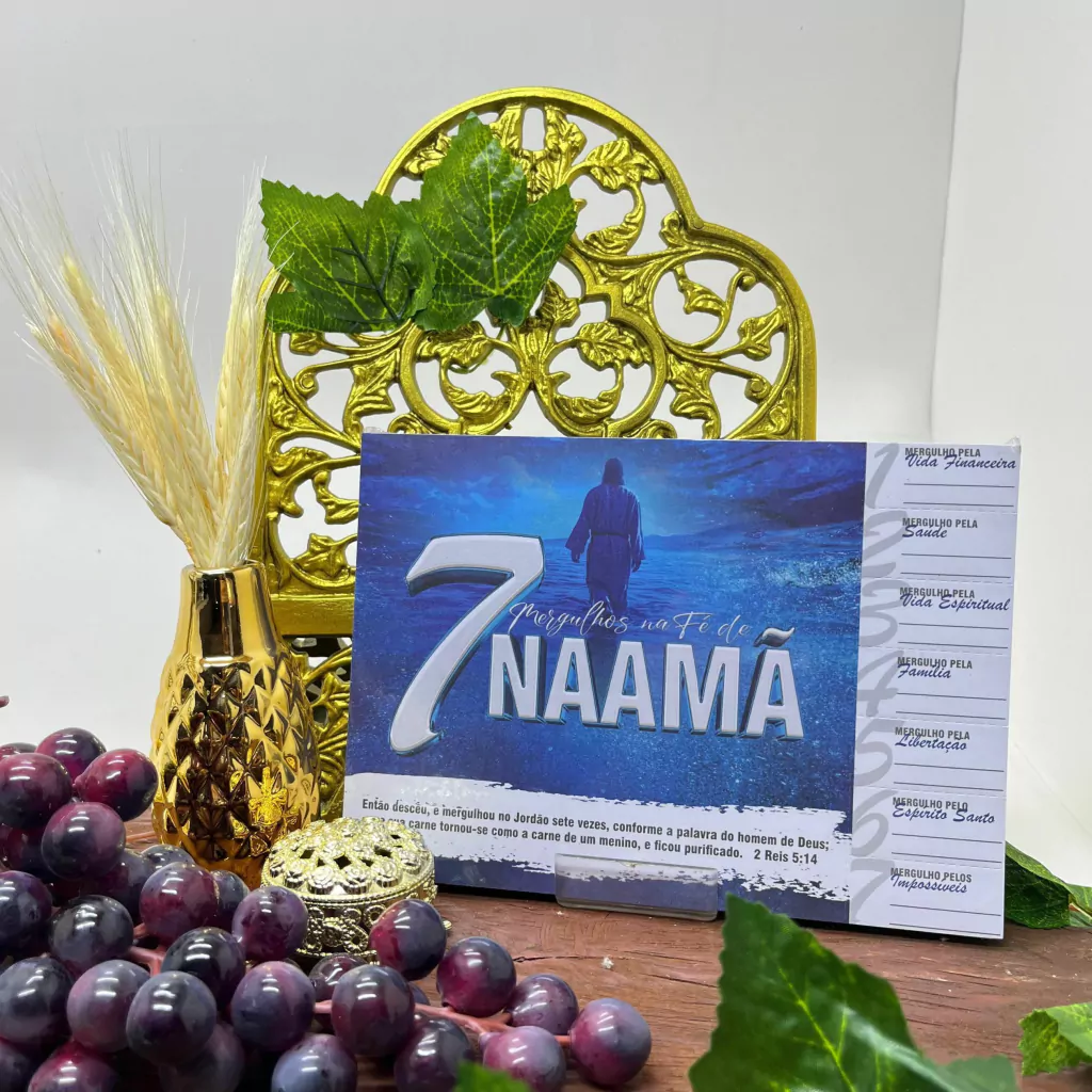 Esta cartela apresenta o tema "7 Mergulhos na Fé de Naamã", inspirado na história bíblica de Naamã, um comandante sírio que foi curado de lepra após seguir as instruções do profeta Eliseu e mergulhar sete vezes no rio Jordão. Cada destaque dessa cartela simboliza um dos aspectos dessa jornada de fé e obediência, destacando os valores de humildade, perseverança e a transformação pela fé.