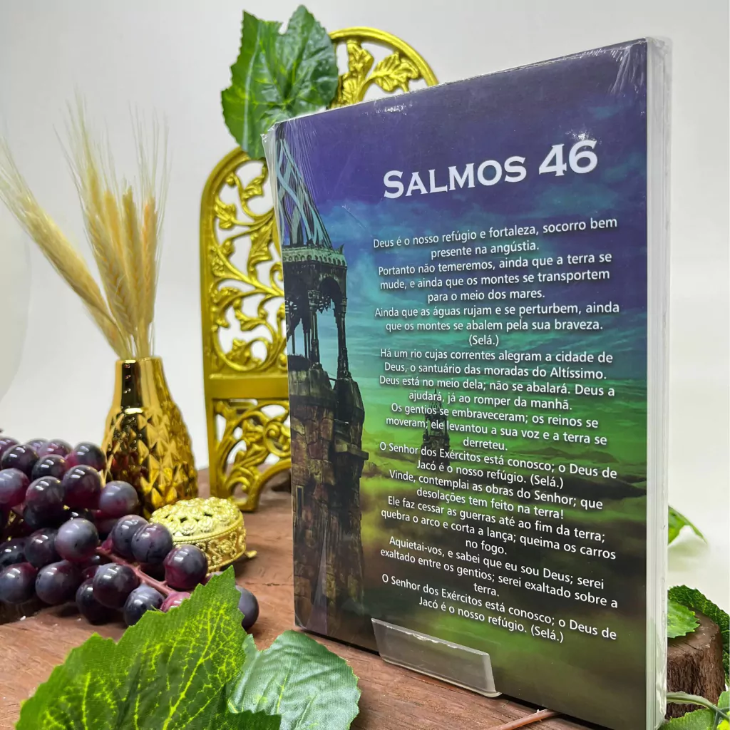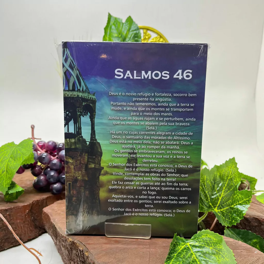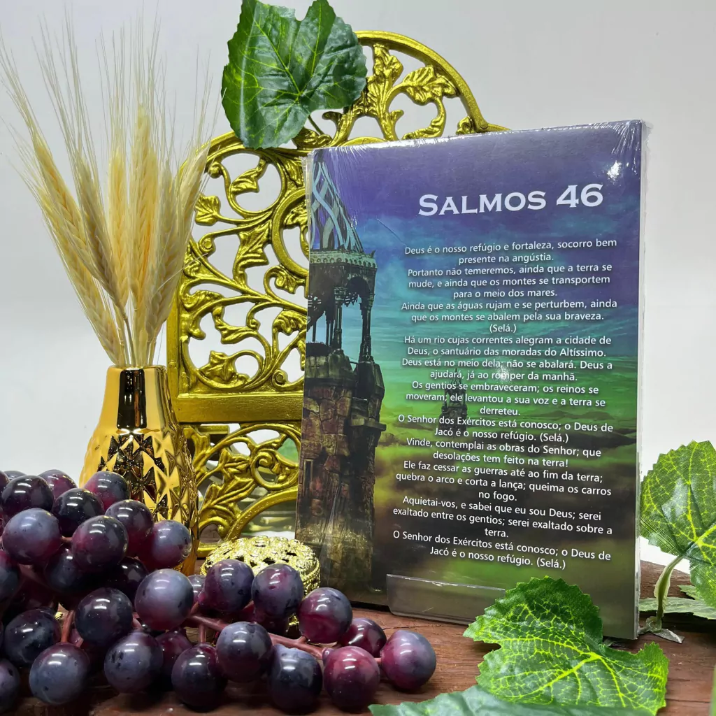 A cartela com o tema Salmo 46 reflete a poderosa mensagem de confiança e segurança em Deus encontrada neste salmo. Enfatizando que Deus é nosso refúgio e fortaleza, mesmo em tempos de crise e tumulto, o salmo nos assegura que, apesar das adversidades e mudanças ao nosso redor, podemos encontrar paz e estabilidade na presença divina. Esta cartela convida à meditação sobre a certeza de que Deus está sempre conosco, oferecendo proteção e força inabaláveis em todas as circunstâncias da vida.
