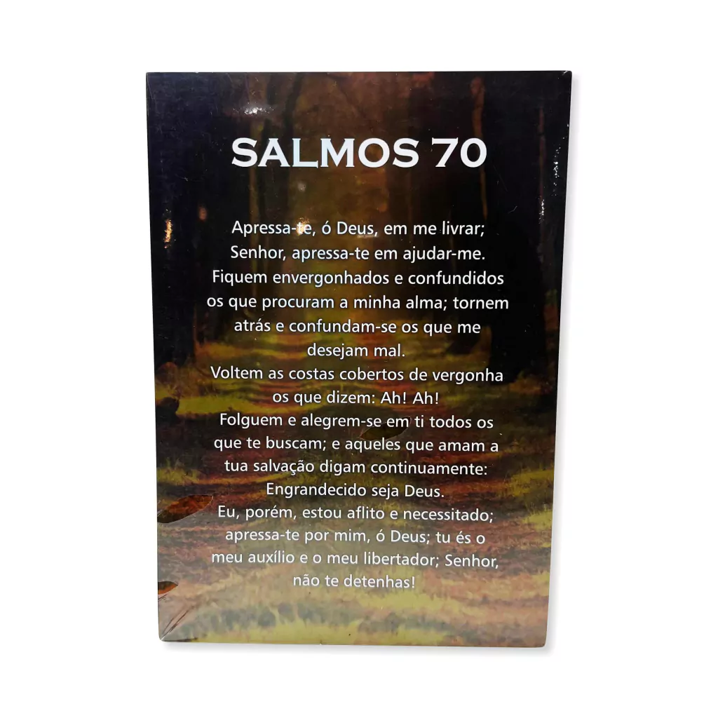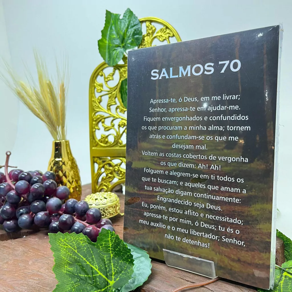 A cartela "Salmo 70" reflete a oração de Davi em busca de auxílio e alívio em momentos de desespero. Neste salmo, Davi clama a Deus para que apresse Sua ajuda, reconhecendo Sua capacidade de livrar e proteger. A mensagem é um poderoso lembrete de que, mesmo nas dificuldades, podemos confiar na intervenção divina e buscar refúgio em Deus com a certeza de que Ele ouvirá e responderá às nossas preces.