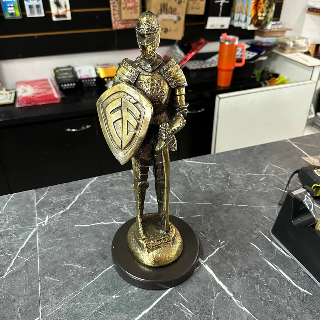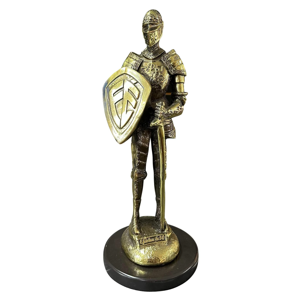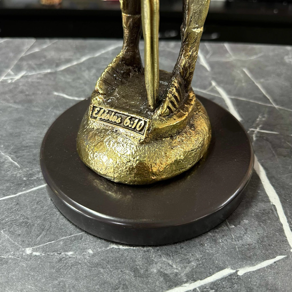 Esta imponente escultura do Guerreiro da Fé é perfeita para decorar escritórios pastorais, altares, salas de oração e ambientes de liderança espiritual.