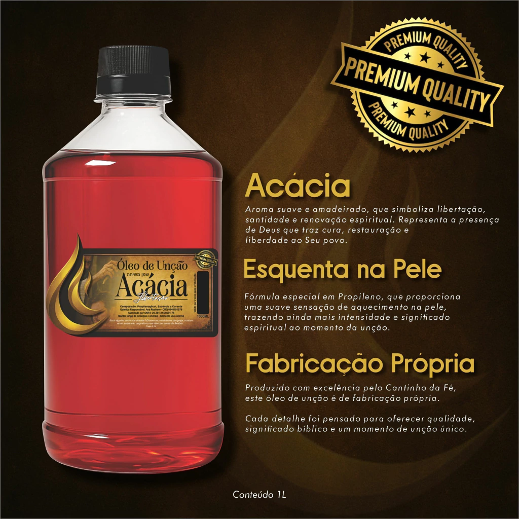 Com 1 litro, o Óleo de Unção Acácia é perfeito para igrejas, ministérios e líderes que desejam utilizar um óleo de qualidade superior, com aroma marcante e profundo valor espiritual, em rituais, cerimônias e momentos de oração.