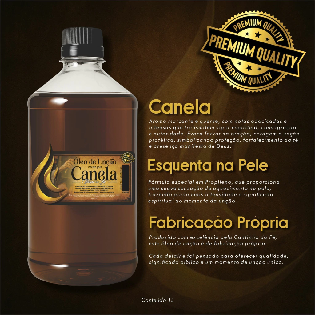 Com 1 litro, o Óleo de Unção Canela é indicado para igrejas, ministérios e líderes que desejam utilizar um óleo de alta qualidade e fragrância envolvente em rituais, cerimônias e momentos de oração, tornando cada ato profético uma expressão de fé e entrega à presença de Deus.