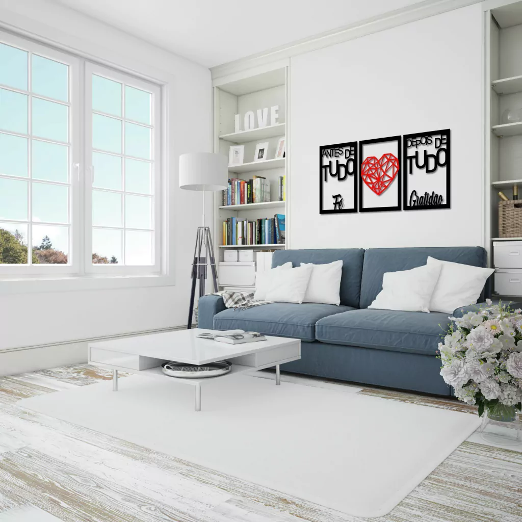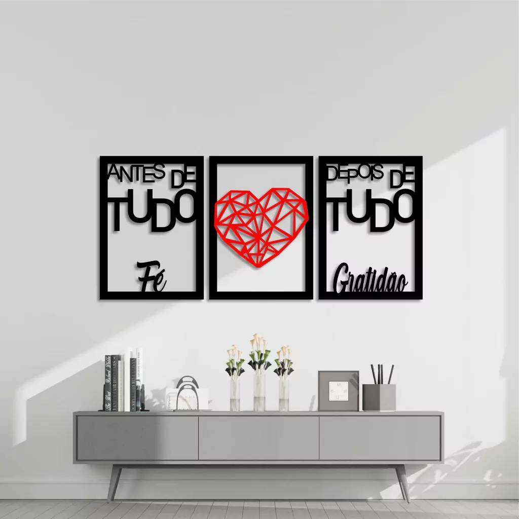 Este trio transcende as paredes, transmitindo uma mensagem poderosa e inspiradora. O primeiro quadro declara "Antes de tudo, fé", encapsulando a importância da crença. O segundo declara "Depois de tudo, gratidão", lembrando-nos da importância de reconhecer as bençãos. Decore sua casa com esse trio lembrando diariamente que a fé nos guia e a gratidão completa nossa jornada.