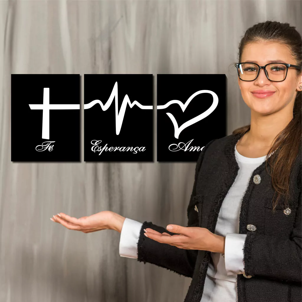 Trio encantador, retratando os valores atemporais de fé, amor e esperança. Cada quadro é uma janela para a alma, transmitindo uma mensagem de inspiração e positividade. Uma arte significativa e elegante para decorar seu quarto ou sala, lembrando-nos diariamente das virtudes que iluminam nossas vidas.