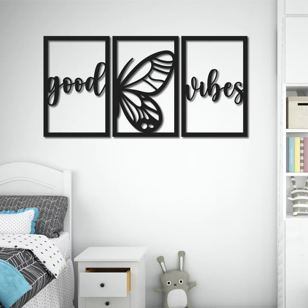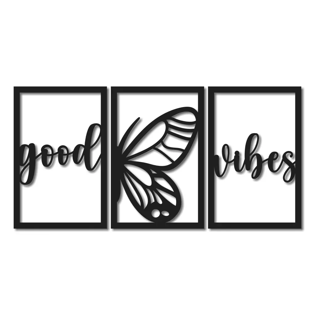 Trio de quadros inspirado em boas vibrações, com a temática "Good Vibes'' e o elemento central representado por uma encantadora borboleta. O conjunto proporciona uma atmosfera positiva e moderna para decorar qualquer espaço em sua casa.
