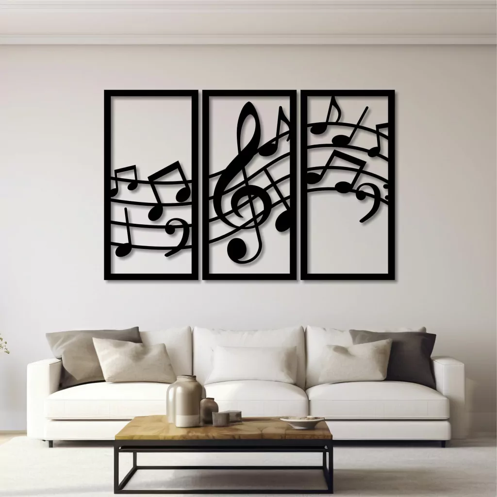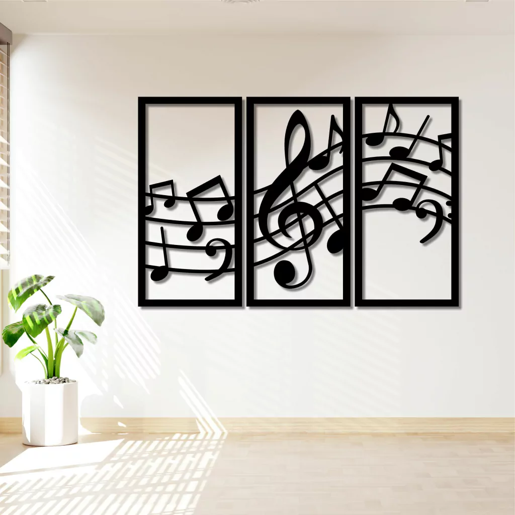 Conjunto de três quadros, dedicado à temática notas musicais. Cada peça apresenta uma representação artística única, combinando formas elegantes e linhas fluidas para criar uma harmonia visual que reflete a beleza da música. Ideal para enriquecer o ambiente com uma atmosfera inspiradora e melódica.