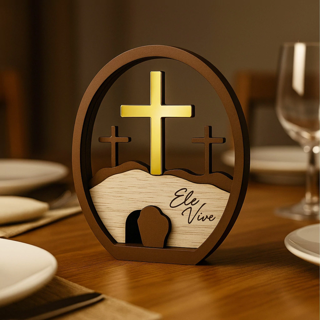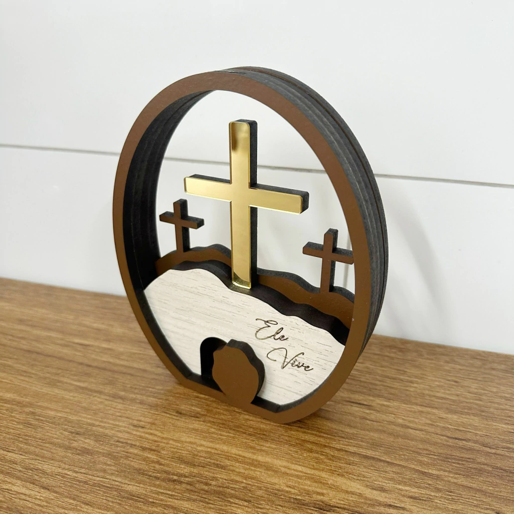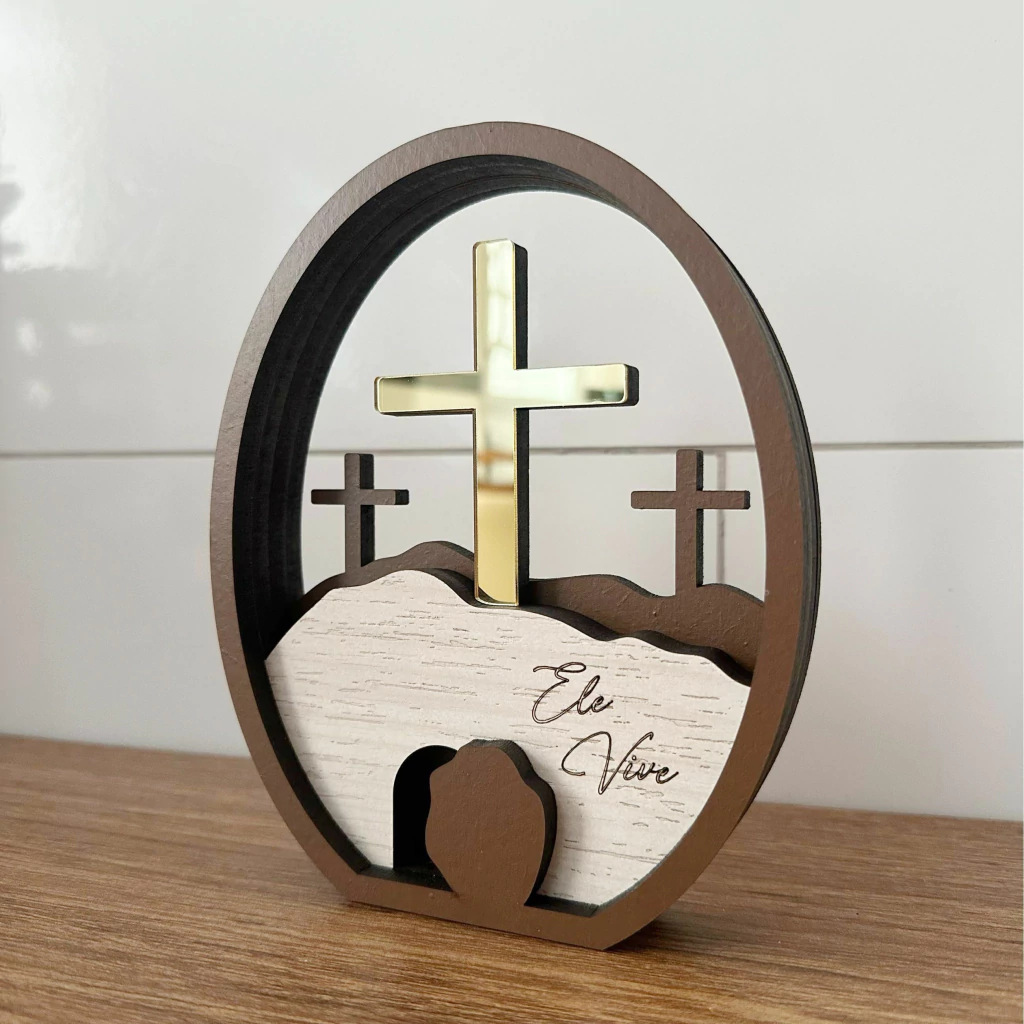 Transforme o ambiente da sua casa com esta linda peça decorativa cristã feita em MDF de alta qualidade. Com o tema "Sepulcro – Ele Vive", essa arte representa de forma simbólica e inspiradora a ressurreição de Jesus, trazendo uma mensagem de fé, esperança e vida.