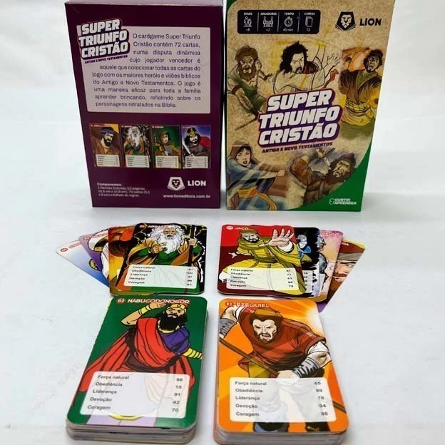 O cardgame Super Triunfo Cristão traz uma disputa divertida e educativa onde o vencedor é o jogador que colecionar todas as cartas do jogo, com heróis e vilões bíblicos do Antigo e Novo Testamentos. Este jogo é uma excelente maneira para toda a família aprender e se divertir ao mesmo tempo, estimulando o conhecimento sobre os personagens bíblicos e sua importância.
