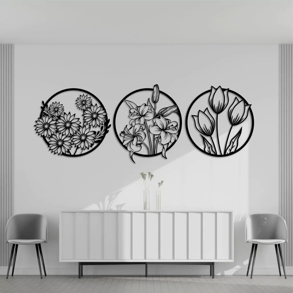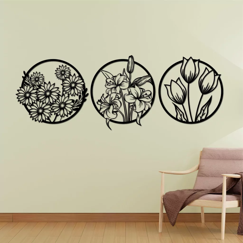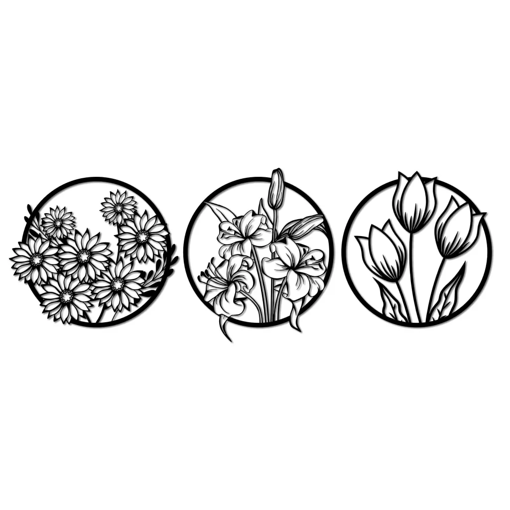 Trio encantador de mandalas, onde a beleza das flores se destaca. Cada mandala captura a essência da natureza com detalhes refinados. Este conjunto é uma edição vibrante e delicada para decorar seu espaço com a beleza da natureza.